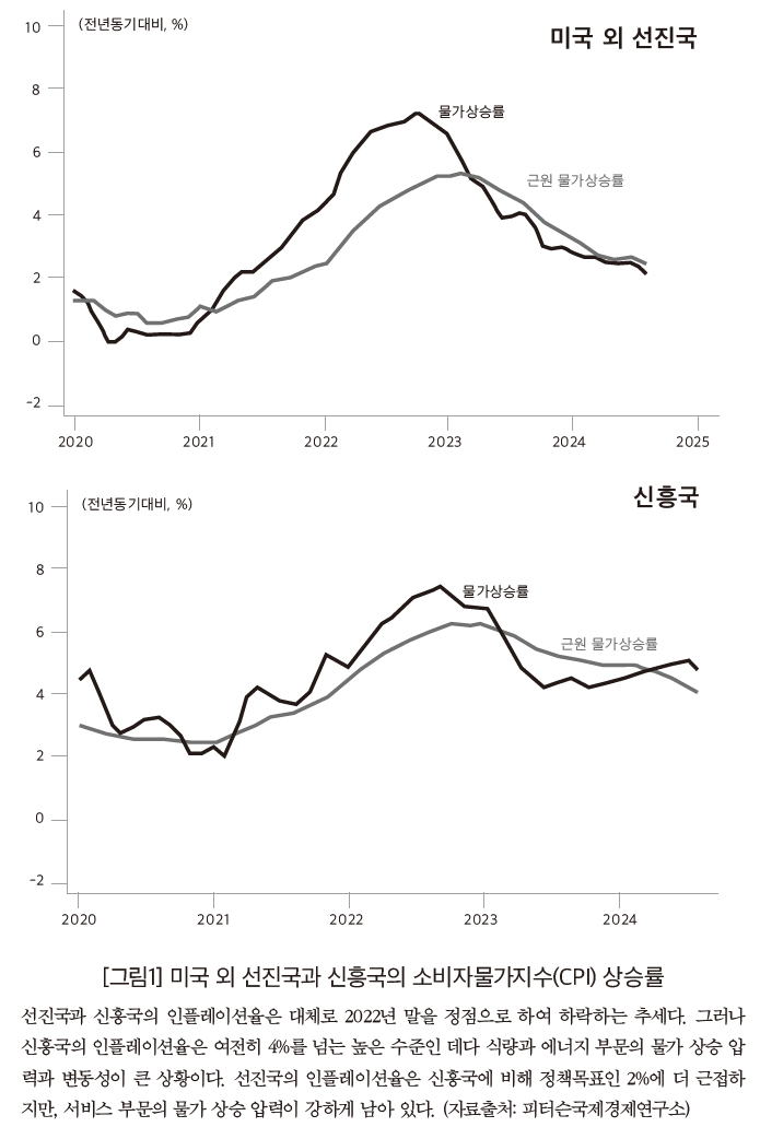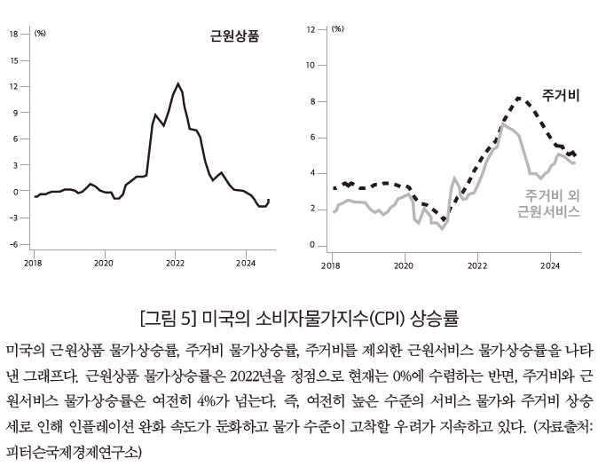 미국경제는 지난해와 마찬가지로 올해 역시 경기침체 없이 인플레이션을 완화하면서, 선진국 가운데 가장 양호한 흐름을 보인다. 미국의 개인소비지출(PCE) 물가지수는 2022년 7월 6.6%를 정점으로 올해 10월 2.1%까지 하락했다. 피터슨국제경제연구소는 PCE 물가지수가 2024년 4분기에 2.4%, 2025년 4분기에는 2.3%일 것으로 전망한다.
