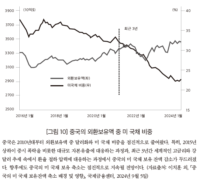 여기에는 경제적 요인과 정치적 요인이 함께 작용했다. 경제적으로는, 중국이 2010년대부터 외환보유 다변화 정책을 추진하며 외환보유액 중 달러화 비중을 2010년 65%에서 2024년 52%로, 점진적으로 축소했다. 그런 가운데 2015년 대규모 자본유출 시기와 최근 3년간 환율 절하 압력에 대응하는 과정에서 미 국채 매도가 두드러졌다. 정치적으로는, 러시아가 우크라이나를 침공한 것에 대응해 미국이 러시아에 전방위적인 금융제재를 시행하는 것을 보고, 중국에서는 미 국채 보유가 중국의 경제안보를 위협할 수 있다는 경계감이 고조되었다. 미중갈등이 지속되면서 중국의 미 국채 보유 축소 역시 점진적으로 이어질 전망인데, 미중관계에 대한 중국식 위험억제 전략의 일환으로 볼 수 있을 것이다.