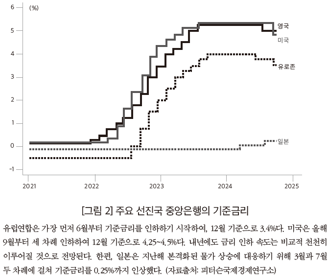 주요 선진국 중앙은행은 하반기로 넘어가면서부터, 통화정책 기조를 전환해 기준금리를 인하하기 시작했다. 이는 인플레이션율 하락과 함께, 경기 침체로 전환될 것이라는 우려를 반영한 것이었다. 유럽 중앙은행은 올해 6월 0.25%p 인하한 데 이어 9월 0.6%p, 10월 0.25%p 인하하여, 12월 초 현재 기준금리는 3.4%다. 미국 연방준비제도이사회(연준)는 올해 9월과 11월에 기준금리를 각각 0.5%p, 0.25%p 인하한 데 이어 12월에도 0.25%p 추가 인하해 기준금리는 4.25~4.5%다.