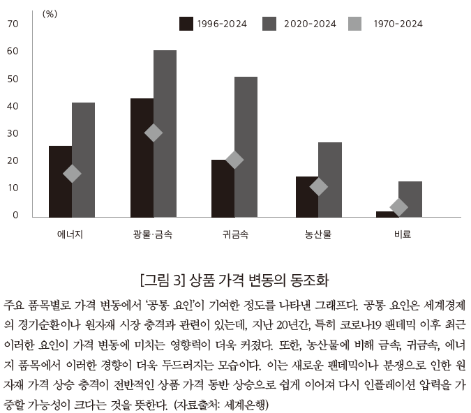 특히, 산업 원자재 가격 변동에서 공통 요인(세계적 요인)의 역할이 상당히 증가했고, 이러한 추세는 코로나19 팬데믹이 발생한 2020년 이후 더욱 뚜렷해졌다. 예를 들어, 지난 4년간 에너지 가격 변동의 41.7%, 비금속(卑金屬, base metal) 가격 변동의 61.4%를 공통 요인이 설명하는 것으로 나타났다. 이는 팬데믹이나 분쟁과 같은 요인이 각 원자재 시장에 미치는 충격이, 전반적인 원자재 가격의 동반 상승으로 쉽게 이어져 다시금 인플레이션 압력을 가할 가능성이 크다는 것을 의미한다.