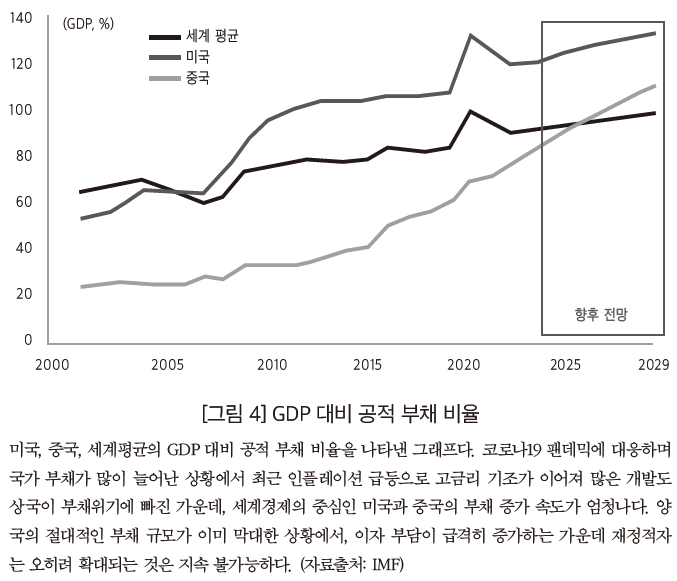 한편, IMF는 개발도상국뿐만 아니라 세계경제의 중심인 미국과 중국의 부채위기가 지속 불가능한 상황이라는 점 역시 강조한다. 양국 모두 현재까지 쌓인 절대적인 부채 규모가 이미 막대할 뿐만 아니라, 고금리로 인해 이자 부담이 급격하게 늘어나는 가운데 여전히 대규모 재정적자를 유지하거나 오히려 확대하고 있기 때문이다. (미국과 중국의 부채위기는 아래에서 자세히 다룬다.) 여기에 더해, 주요국 중앙은행이 통화정책을 전환하는 과정에서 금융시장의 변동성이 급격히 확대할 수 있다고 지적한다. 예를 들어, 지난 8월 일본이 마이너스 금리 정책에서 금리 인상 정책으로 선회한 가운데 미국이 금리를 인하할 것이라는 전망이 우세해지자, 일본 금융기관에서 저금리로 엔화를 빌린 뒤 이를 달러로 바꾸어 미국 금융시장에 투자하는 이른바 ‘앤 캐리 트레이드’ 자금이 대규모로 빠져나가 미국 증시가 폭락하고 환율이 급변하는 일이 있었다. IMF는 이러한 세계 금융시장 변동성의 확대가 금융 여건을 긴축하면서 부채위기를 강화할 수 있다고 지적한다. 나아가, 장기저성장 시대에 가중되는 부채위기는 역으로 투자와 성장을 저해하고 금융시장 불안을 자극하는 악순환을 그린다고도 지적한다. 결국, 부채위기가 2020년대 세계경제에 중대한 기저질환으로 작용하고 있다고 할 수 있다.