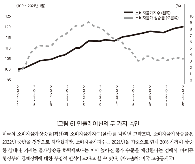 미국의 마르크스주의 경제학자 마이클 로버츠는 이러한 현상이 미국경제 내의 양극화를 반영하는 것이라고 설명한다. 첫째, 거시경제가 성장하고 금융시장이 호황이지만, 일반 미국 가계는 그렇지 못하다. 무엇보다 물가상승률과 물가 수준을 구별해야 하는데, 가계가 체감하는 인플레이션은 ‘물가 상승 속도’보다는 ‘물가 수준’의 영향을 더 크게 받는다. 바이든 행정부가 취임한 2021년 1월의 소비자물가지수를 100이라고 할 때, 최근의 소비자물가지수는 120으로 20% 상승했으며, 특히 필수구매 항목에 해당하는 에너지(41%), 교통(40%), 주거(22%), 식료품(21%)의 가격 수준이 두드러지게 상승했다. 요컨대, 기본 생필품 물가 수준의 대폭 상승이 인플레이션율의 하락을 압도하고 있는 셈이다. 그는 이런 가운데 소득과 부의 불평등이 더욱 심해지고 있다고 지적한다. 2022년에 미국인 상위 1%가 전체 개인 소득의 20.8%와 전체 개인 부의 35%를 소유한 반면, 하위 50%는 각각 10.3%와 1.5%만을 소유하고 있다는 것이다.