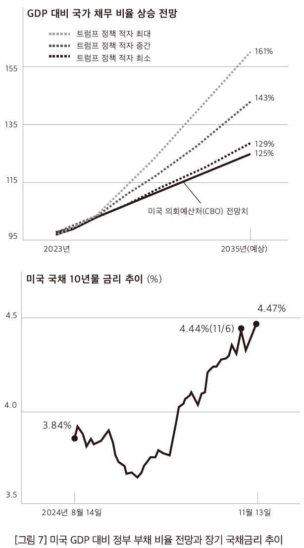 미국 책임있는 연방 예산위원회(CRFB)는, 트럼프의 공약이 시행되면 미국의 재정적자가 향후 10년간 최대 15조 5천억 달러 증가할 것이고, 장기 국채금리가 상승해 순이자 지급액도 1조 달러 증가할 것으로 예상했다. 역사적으로 장기 국채금리는 GDP 대비 정부 부채 비율이 1%p 상승할 때 약 2~3bp(1bp는 0.01%p) 상승하는데, 한국은행은 트럼프의 공약이 향후 10년간 장기 국채금리를 43bp 상승시키는 압력으로 작용할 가능성이 있다고 지적한다.