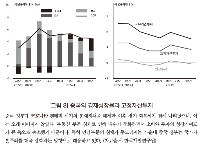 중국 경제는 지난해와 마찬가지로 세계적인 인플레이션 문제를 겪지 않는 대신, GDP의 약 40%를 차지하는 부동산 부문의 침체와 부채위기가 지속하면서 경기회복이 부진한 상태다. 중국의 2024년 경제성장률은 전년동기대비 1분기에 5.3%를 달성했지만 2분기에 4.7%, 3분기에는 4.6%로 하락하면서, 3분기까지 누적 성장률은 4.8%를 기록했다. 4분기에도 성장률이 반등할 가능성은 크지 않기에, 2024년 연간 경제성장률은 중국 정부의 목표치인 5%에 미달하는 4% 후반일 것으로 전망된다. 나아가 이러한 성장세 둔화 흐름은 내년에도 이어져, 2025년 경제성장률은 4.5%일 것으로 보인다.
