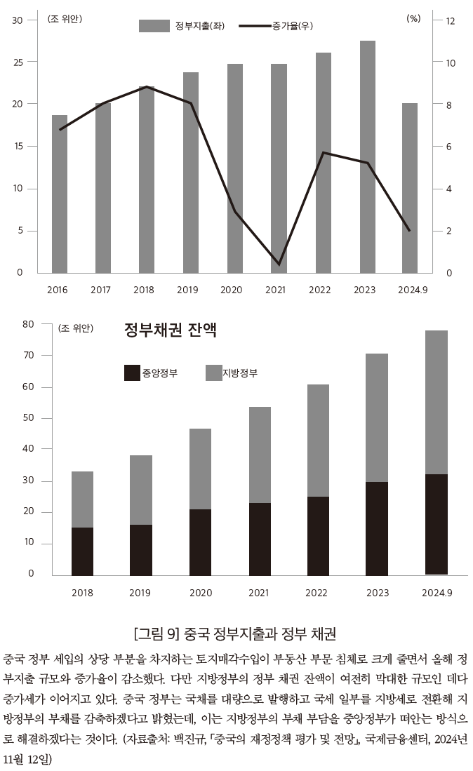 전체적으로 볼 때, 중국 정부가 이번 하반기에 발표한 경기부양 정책은 이전 시기와 달리 직접적인 대규모 재정투여보다는, 완화적인 통화정책과 정부 투자 확대를 통해 간접적으로 수요를 촉진하는 한편 지방정부 부채를 관리하는 안정화 정책에 가깝다고 평가할 수 있다. 이는 전체 세입의 약 20%를 차지하는 토지매각수입이 3년 연속 크게 줄면서 대규모 확장적 재정정책을 펼칠 여력이 줄어든 가운데, 향후 경기부양을 위해서라도 지방정부의 재정건전성과 부채위기를 관리하는 것이 우선시되어야 한다는 판단에 따른 것으로 보인다. 다만 이를 위해 국채를 대규모로 발행하겠다고 밝힌 만큼, 중국 경제는 계속해서 부채에 의존하며 중앙정부로 부담을 집중하는 경로로 나아갈 것으로 보인다.