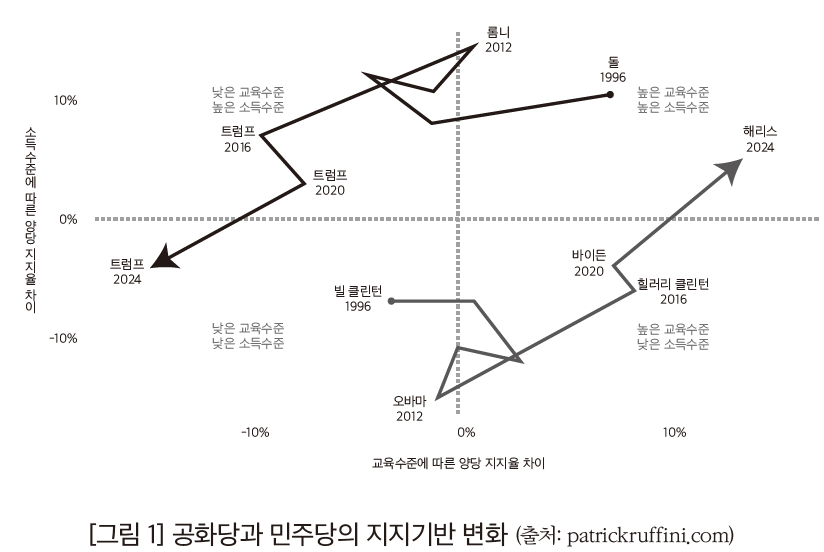 공화당의 정치전략가 패트릭 루피니는 2023년 저서 『인민의 당: 다인종의 인민주의적 연합이 공화당을 재편하다』에서 이번 대선의 집단별 지지율 변화를 예측함으로써 유명해졌다. 그는 민주당이 20세기 중반에 구축한 ‘뉴딜 연합’이 점차 와해되며, 1990년대부터 지금까지 30년 동안 민주당과 공화당의 지지층이 뒤바뀌어 왔음을 묘사한다. 민주당이 소득과 교육 수준이 높은 집단에 의존하는 당이 된 반면, 공화당은 저소득, 낮은 교육 수준의 층을 대변하는 정당으로 변모했다는 것이다.