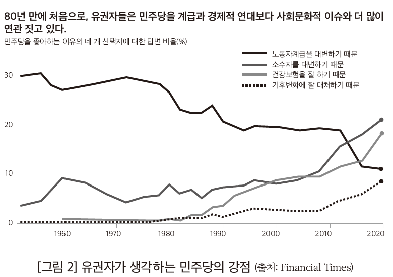 문제는 민주당이 과거 20세기 중반에 추구했던 전략으로 왜 회귀할 수 없는가다. 당시는 노동조합 조직률 상승과 선거에서 노동조합과 민주당의 연계 강화로 민주당이 안정적으로 선거에서 승리했고, 60년대 민권운동에 힘입어 유권자 연합을 확대했다. 그러나 경제호황이 끝나면서 노동조합운동이 힘을 잃었고, 더는 그런 전략을 추구할 수 없게 되면서, 경제구조의 신자유주의적 개혁과 동시에 사회문화적 이슈에서 진보적 입장을 강화하는 방향으로 민주당이 변모한 것이다. 이런 과정을 이해하려 하지 않고 옛날처럼 재분배, 임금과 복지 확대를 외치면 된다는 것은 현실성이 없다.