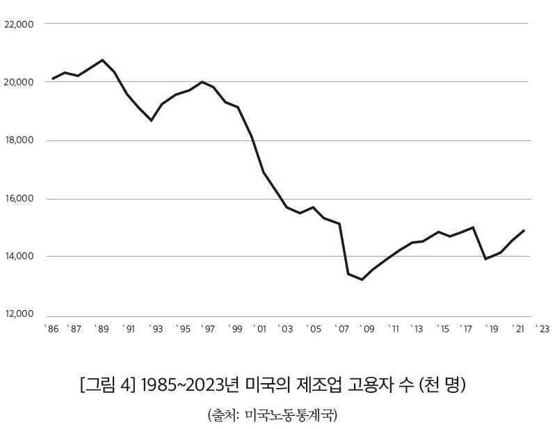 2023년에 미국 노동부는 향후 10년 동안에도 이전과 변함없이 제조업 고용 비중이 하락할 것으로 전망했다. 제조업은 여전히 경제에서 중요한 역할을 하겠지만, 더는 과거처럼 저숙련 노동자에게 거대한 고용 기회를 제공하는 주요 원천일 수 없다. 전문가 대다수가 변화한 현실에 발맞춰 새로운 기술과 산업을 발전시키고, 교육을 통해 숙련된 노동력을 육성하는 방향성을 제안하는 이유이다.