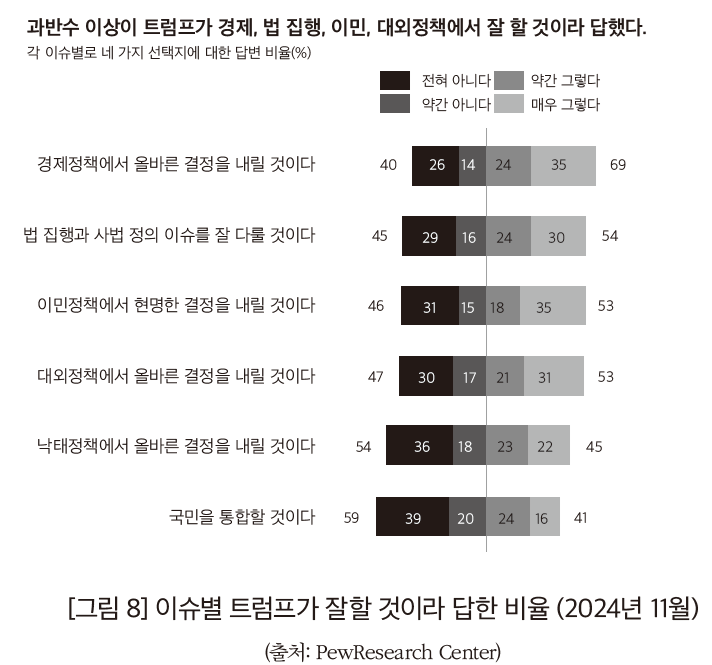 미국 유권자들은 이번 대선에서 트럼프가 해리스보다 미국 경제를 더 잘 살릴 것이라 기대했다. 트럼프도 ‘미국을 다시 위대하게’라는 구호로 이를 약속해왔다. 심지어 한국에서도, 트럼프 당선이 한국의 이익에는 위협이겠으나, 자국민의 이익을 중시하는 대통령이 나온 게 부럽다는 반응이 심심치 않게 보인다.