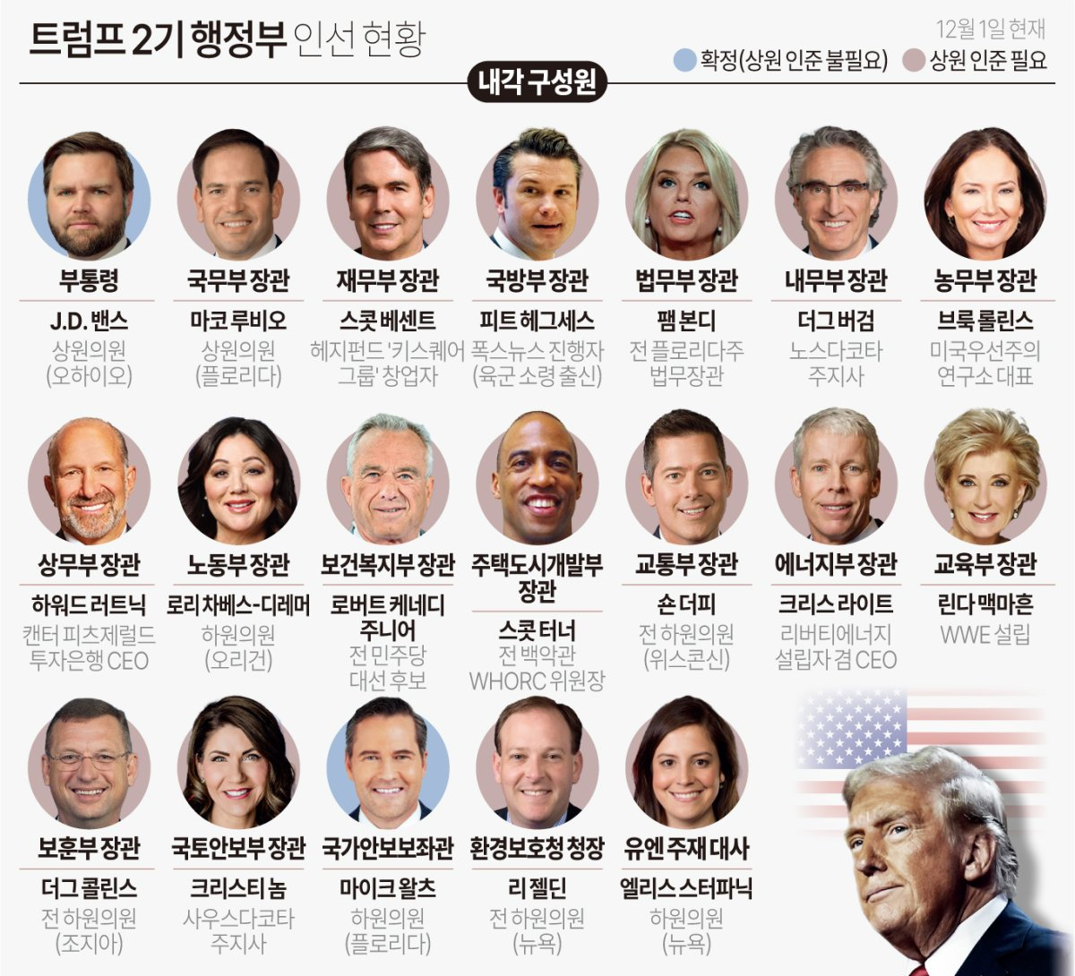 트럼프 2기의 첫 인선은 현재 거의 완료된 상태다. 이번 인선의 특징은 ‘충성심’, ‘비전문성’, ‘젊음’이다. 장관 및 장관급 직책 26개 중 현재까지 24명이 지명됐는데, 이중 ‘확고한’ 충성파가 18명이다. 1기 때 트럼프주의자가 아직은 부족한 상황에서 기존 보수주의자 엘리트에 의존했다가 이들의 각종 비판과 저항에 부딪혔던 경험 탓이다.
