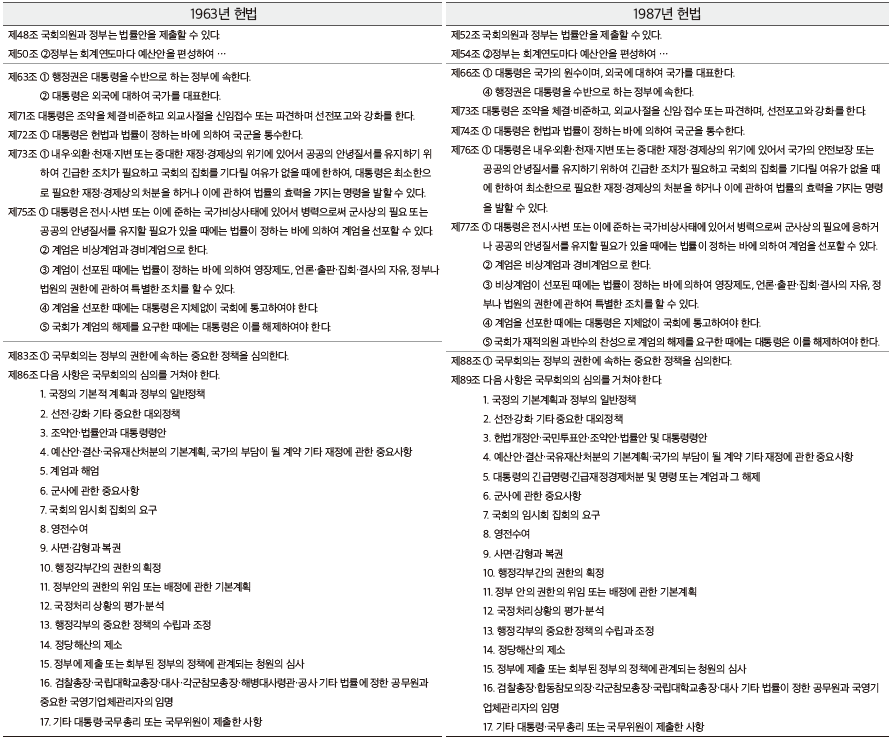 1963년 제3공화국 헌법과 현행 1987년 헌법에서 대통령과 국무회의와 관련한 조항을 비교해보면, 이 점을 명확히 알 수 있다. 위의 표를 살펴보면, 조항이 거의 비슷한 것을 확인할 수 있다. 이런 유사함은 김영삼과 김대중이 민주화를 유신 이전으로의 복귀로 사고했고, 대통령이 될 수 있다는 생각에 권한과 관련하여 숙고하며 논의하지 못했다는 증언 혹은 추론을 뒷받침한다.