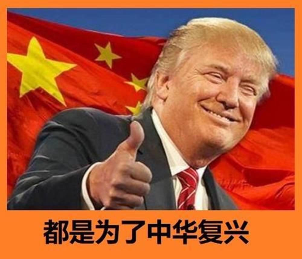 2020년 10월 23일, 《홍콩경제일보》는 트럼프 대통령, 즉 ‘촨젠궈 동지’의 ‘미국 우선’ 정책이 오히려 중국의 영향력을 확대할 기회를 주었다고 비웃는 중국 내 여론을 다뤘다. 이 그림은 중국 네티즌이 만든 관련 이미지 중 하나다. 중국 오성홍기를 배경으로 엄지를 치켜든 트럼프의 모습과 함께 “전부 중화[민족]의 부흥을 위한 거야”라는 문구가 있다.