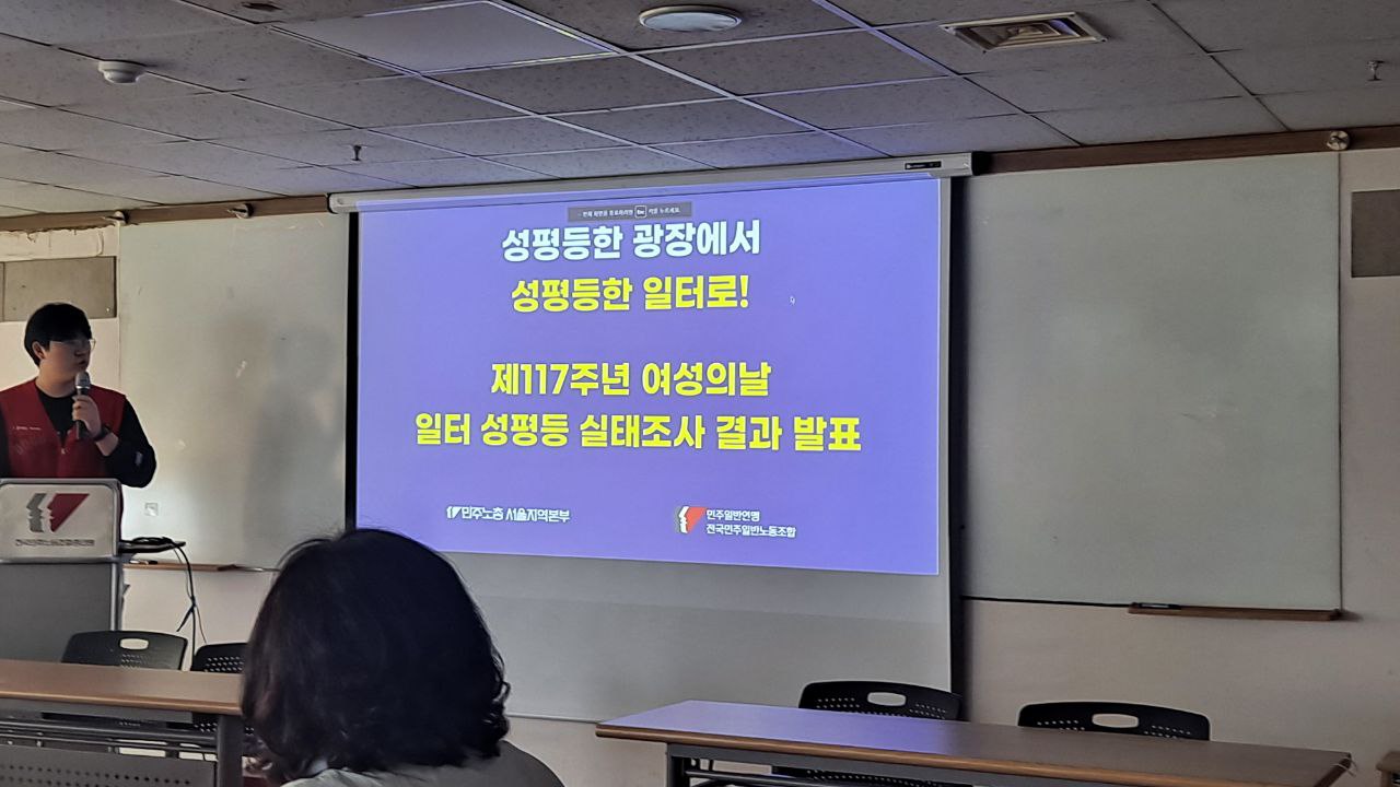 올해 3월 8일 세계여성의날을 맞아 민주노총 서울본부에서는 청년위원회, 여성위원회가 <성평등한 광장에서 성평등한 일터로> 집담회를 열어 광장의 시민들과 함께 이야기하는 자리를 마련했다. 참가자는 민주노총에 관심을 가지고 연대하는 청년들이었다. 이 자리에서는 사전 실태조사로 파악한 집담회 참가자들의 노동 조건을 분석하고, 여성위원회에서 제작한 여성의날 교육 영상을 시청했다. 이후 이어진 토크 콘서트 및 플로어 토론 자리에서 한 참가자가 교육 영상에 대한 소감으로 “학습지 교사와 면세점 판매직 노동자들도 노동조합을 설립하고 활동하고 있는지 몰랐다”고 한 말이 가장 기억에 남았다.