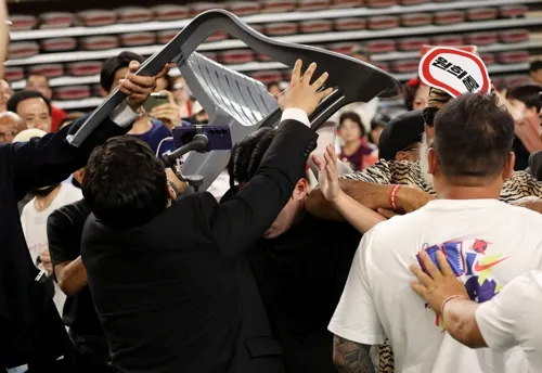 2024년 7월 15일 국민의힘 대전·세종·충북·충남 합동연설회에서 한동훈 후보와 원희룡 후보 지지자 간 몸싸움이 벌어졌다. 한 후보가 연설을 할 때 원 후보 측 지지자들이 ‘배신자’를 반복해 외쳤고, 이에 한 후보 지지자들이 항의하며 충돌했다. 한 당 내에서 상대방 후보에 ‘배신자’ 프레임을 씌우고, 연설을 방해하고, 폭력을 촉발하는 행위는 어쩌면 우리가 앞으로 자주 볼 풍경이 될 수도 있다. (사진출처: 《경향신문》)