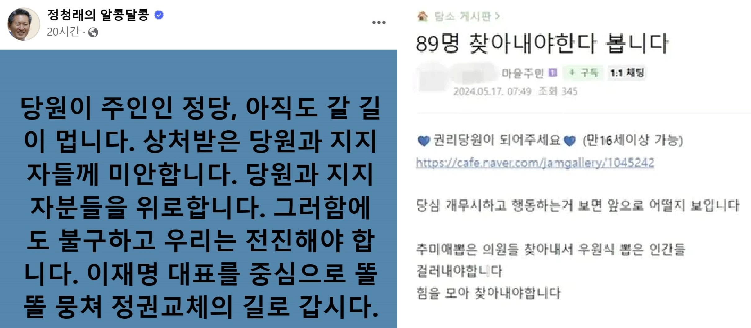 이재명 대표 지지자들의 온라인 커뮤니티 ‘재명이네 마을’에 올라온 글(오른쪽)