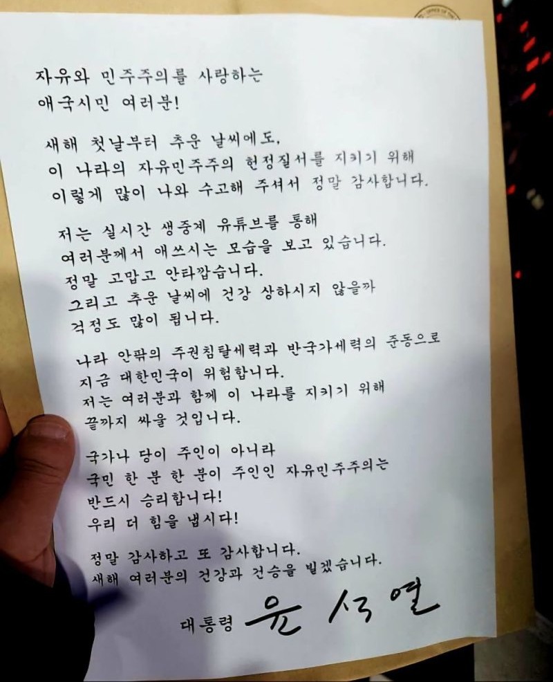 [그림] 2025년 1월 1일 윤 대통령이 한남동 관저 앞에 모인 지지자에게 보낸 메시지