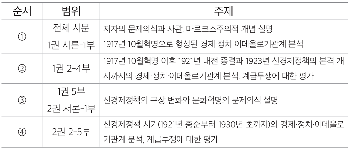 『소련에서의 계급투쟁』의 특징은, 소련의 ‘계급관계’에 대한 분석으로부터 모든 논의를 전개하려 하며, 그 세 가지 차원을 경제-정치-이데올로기의 순서로 설명하려 한다는 점이다. 1권의 대상 시기에 대한 설명은, 2부의 경제관계·계급관계 분석, 3부의 정치관계 분석, 4부의 이데올로기관계 분석의 순서로 진행된다. 2권의 신경제정책 시기에 대한 설명 역시, 1-3부의 경제관계·계급관계 분석으로부터 4부의 정치·이데올로기관계 분석으로 나아간다.