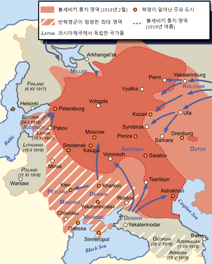 제국 서부의 주요 도시들에서 일어난 혁명을 토대로 세워진 소비에트 정부의 통치 영역은 제국 영토의 일부에 지나지 않았다. 10월 혁명 직후 통치 영역을 기준으로, (현재 우크라이나에 속하는) 남쪽의 농촌 지역과 동쪽 볼가강 유역의 농촌 지역에서 반혁명군(백군)이 형성되어, 1918년 여름 소비에트 정부를 향해 공격을 개시하며 내전이 시작된다. 한편, 우랄산맥 너머의 동쪽 지역은 제1차 세계대전부터 혁명, 내전 발발까지의 정치적 혼란과 다소 무관하게 있었는데, 내전에서 백군이 점점 동쪽으로 밀려나며 점차 전란의 화마와 정치적 격변을 겪게 된다. (출처: 위키피디아)