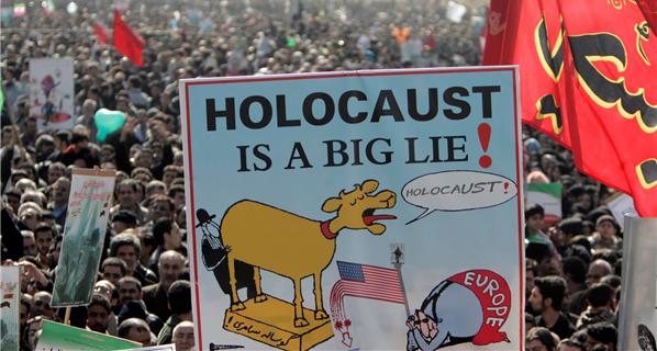 메이어 리트박 교수에 따르면, 이란과 아랍세계는 나치에 의한 홀로코스트를 부정한다. 특히 이란의 경우, 《카이한 인터내셔널》, 《테헤란 타임즈》 등의 관영매체 혹은 친정부언론은 홀로코스트가 이스라엘을 건국하기 위한 유대인의 조작이라고 주장하며 유대인에 의한 팔레스타인과 무슬림의 피해야말로 진정한 홀로코스트라고 주장한다. 실제 이란에선 1월 27일 국제 홀로코스트 추모일에 ‘홀로코스트 만화 경진대회’를 개최한다. 대회는 홀로코스트와 유대인을 조롱하는 만화 중에서 가장 높은 평가를 받은 만화를 그린 사람에개 약 5만 달러의 상금을 수여한다. 서방의 비판에 이란 정부는 단지 민간단체 행사일 뿐이라고 일축한다. 사진은 2006년 이슬람혁명 기념일 집회의 반유대주의 피켓으로, “홀로코스트는 거대한 거짓말!”이라고 쓰여있다. (사진출처: 《로이터》)