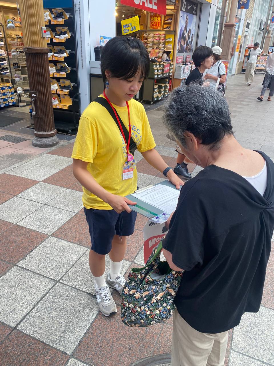 원수폭금지세계대회의 공식 일정이 마무리된 뒤, 8월 9일 오후 나가사키 시내에서 일본 및 세계 각국의 참가자가 일본 정부의 핵무기금지조약 가입을 요구하는 서명운동 선전전을 벌였다. 필자(왼쪽)가 든 서명 용지에 일본 시민이 서명하고 있다.