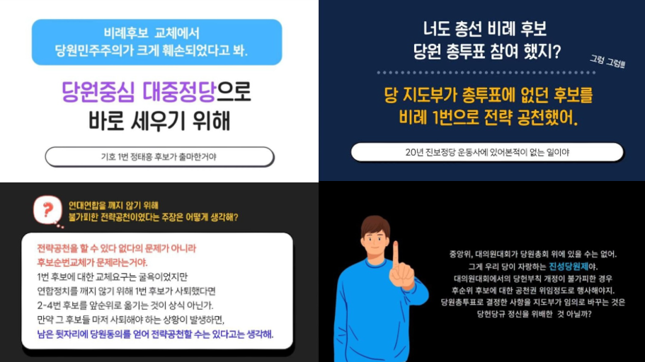 2024년 6월 진보당 3기 상임대표 선거에서 김재연 1·2기 상임대표를 상대로 출마한 정태흥 후보 선본 측에서 만든 영상 캡처. 같은 해 3월 총선 과정에서 진보당 지도부가 민주당의 요구로 민주당 비례위성정당(더불어민주연합)에 참여하는 진보당 측 비례대표 후보를 교체한 과정을 ‘당원민주주의의 훼손’으로 비판하는 데 초점을 두었다.