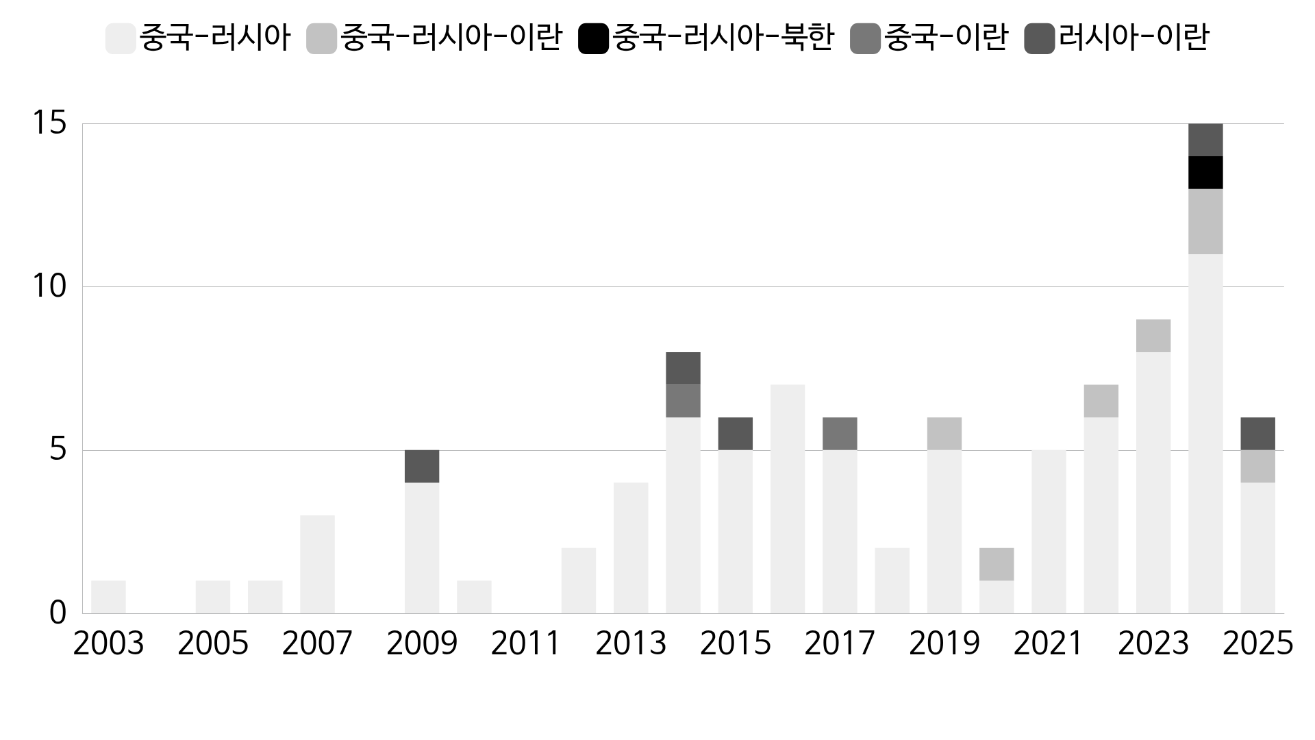 미국 전략국제문제연구소(CSIS)에 따르면, 중국과 러시아, 이란 그리고 북한 간에 두 국가 이상의 합동 군사훈련이 늘어나는 추세다. 2003년 중국과 러시아가 첫 합동 군사훈련을 진행한 이래 2025년까지 두 국가 이상이 참여한 합동 군사훈련이 총 96회였고, 2022년 이후에만 연평균 9.5회였다. 이란은 2019년 이후 중국, 러시아와 삼자 합동군사훈련을 매년 진행하고 있으며, 북한은 2024년에 중국, 러시아와 해군 훈련에 처음으로 참여했다. (자료출처: CSIS)