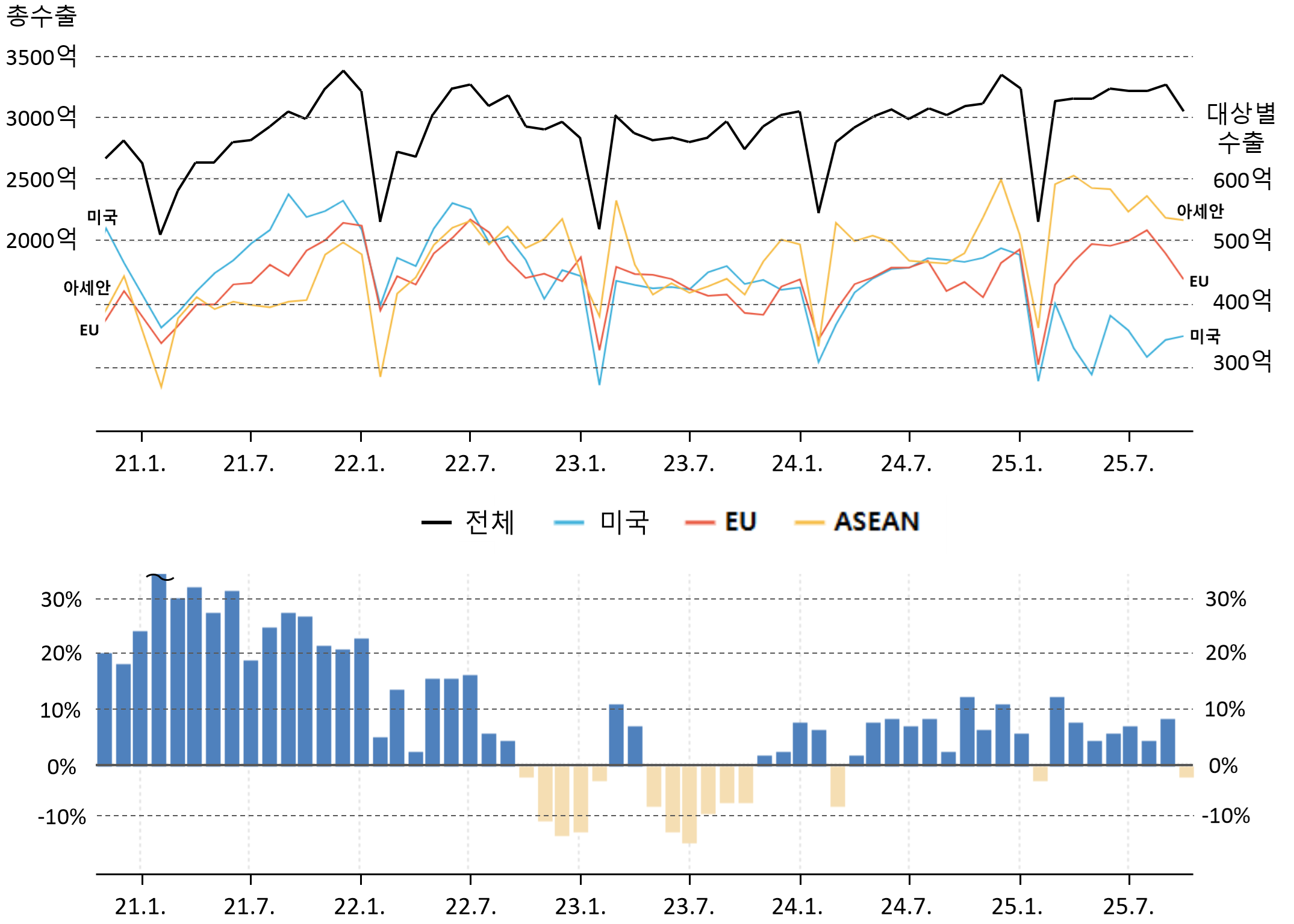 위: 2020년 11월~2025년 10월 중국의 총수출액(왼쪽) 및 미국·EU·ASEAN 대상 수출액(오른쪽) (달러, 월 단위)