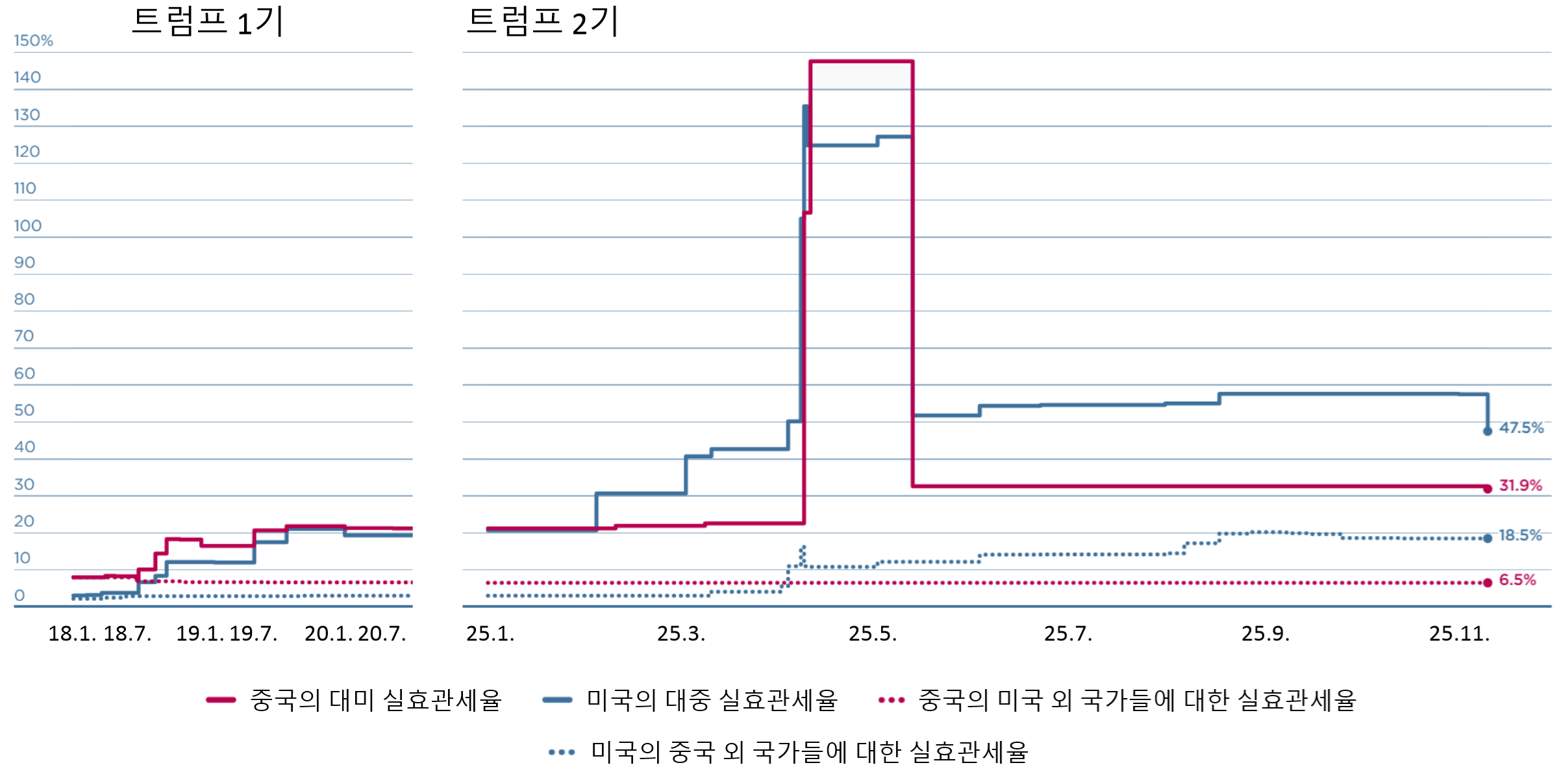트럼프 1기부터 바이든 행정부까지 미국의 대중 실효관세율은 19.3%였고, 나머지 국가 대상 실효관세율은 3.0%에 그쳤다. 그러나 이는 [그림]에서 보듯 트럼프 2기 들어 급격히 상승해, 2025년 11월 10일 기준 각각 47.5%, 18.5%에 이르렀다. 관세 정책의 범위와 강도가 1기와 질적으로 다른 수준에 도달했다고 볼 수 있다.