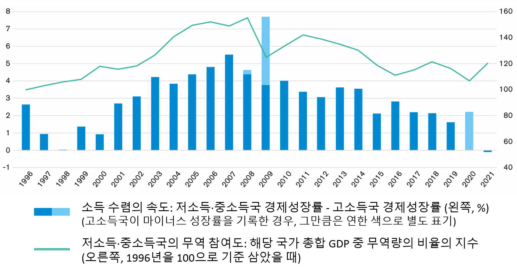 1990년대 중반부터 세계화는 선진국에서 개도국으로의 FDI 확대와 개도국에서 선진국으로의 제조업 수출 확대를 핵심 동력으로 삼아, 저소득·중소득 국가의 빠른 성장을 이끌고 국가 간 소득 수렴과 불평등 완화에 기여해 왔다(위 [그림]). 국제상품무역의 중심도 고소득 국가 간 교역에서 선진국과 신흥시장 간 교역으로 이동했다. 물론 모든 개도국이 소득 수렴을 경험한 것은 아니었다. 실패한 사례는 대체로 국제무역 참여도가 낮거나, 참여하더라도 자원 수출에만 의존해 제조업 수출로 전환하지 못한 경우였다. 이러한 국가들은 공통적으로 FDI 유치에도 실패했다. 이는 과거 사회진보연대가 지적해 온 신자유주의 금융세계화 질서로의 ‘포섭과 배제’라는 구조와 정확히 맞물린다.