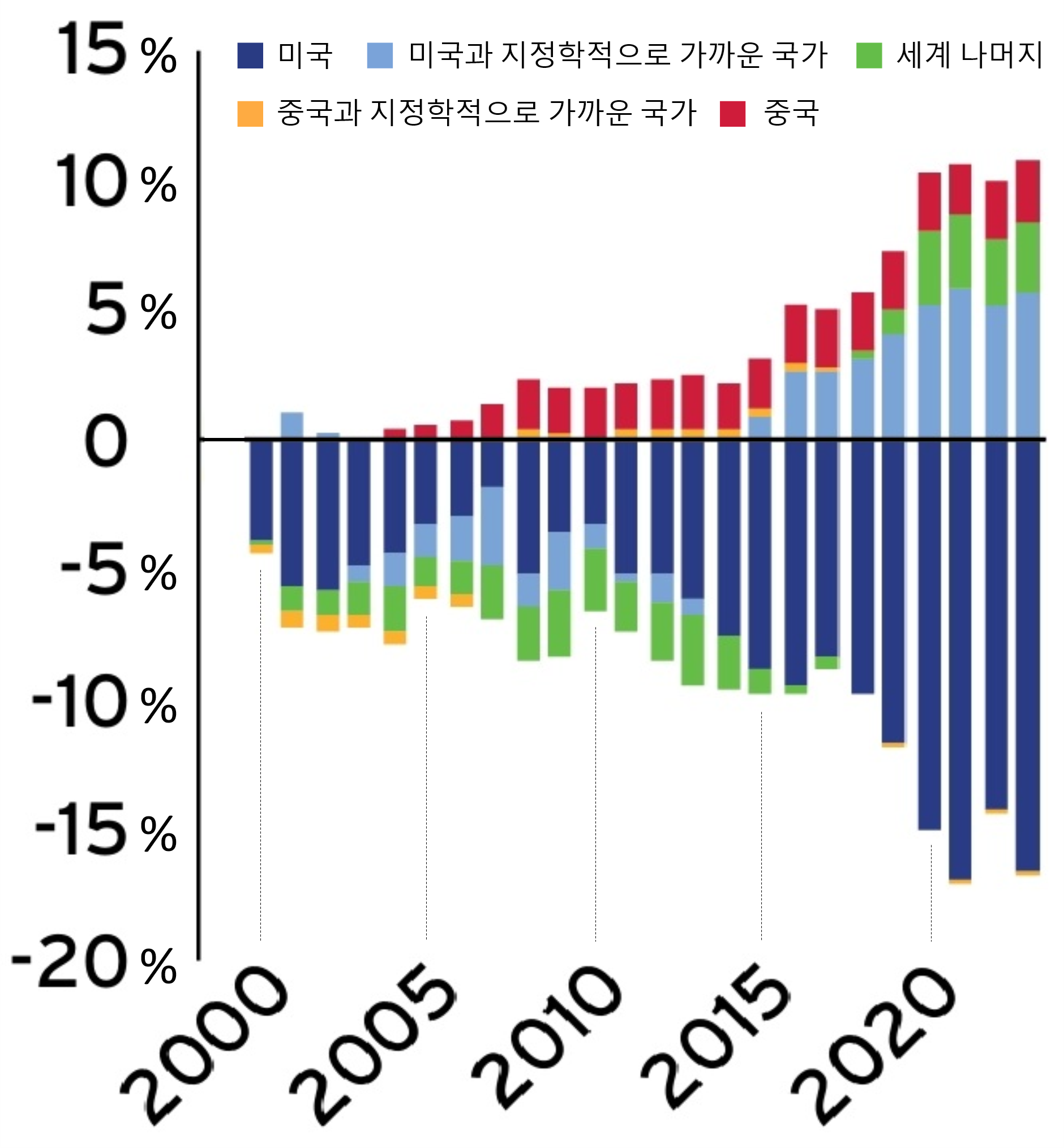 세계 금융위기 이후 미국과 중국, 이른바 G2의 정책 노선이 변화하면서 앞서 살펴본 국제무역·국제금융의 패턴이 달라졌다는 연구가 최근 급증했다. 이러한 변화를 설명하는 핵심 키워드는 ‘분절화’(fragmentation)다. 분절화의 시작 시점을 두고는 학자마다 견해가 갈려, 멀게는 세계 금융위기 직후인 2010년 전후부터, 가깝게는 트럼프 1기 행정부가 출범한 2017년 이후로 본다. 그러나 세계경제에서 분절화가 진행되고 있다는 인식 자체는 이제 지배적인 시각이 됐다. 최근 몇 년의 논의에서 분절화는 주로 ‘블록화’를 의미한다. 즉 1990~2000년대 미국을 비롯한 선진국과 신흥시장 간 상품·자본 거래가 확대되던 세계화 국면에서 벗어나, 미국을 필두로 유럽·동아시아의 선진국과 일부 신흥시장이 결합한 미국 블록과, 중국을 중심으로 이른바 ‘글로벌 사우스’라 불리는 다수의 개발도상국이 포진한 중국 블록 사이에서 무역과 금융 거래가 감소하고 있다는 것이다.