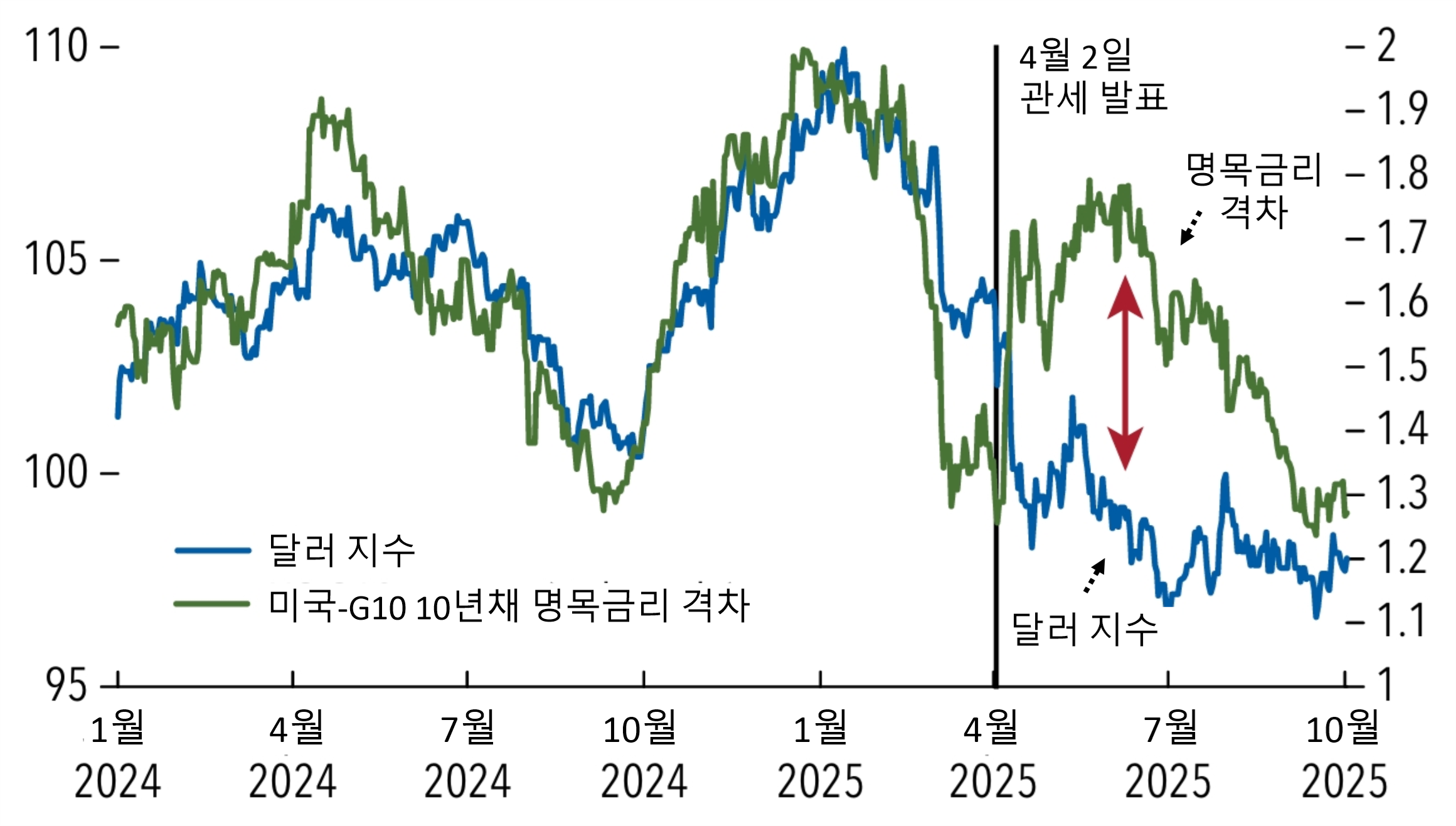 최근 1470원을 돌파한 원/달러 환율의 상승은 단기적 불안이나 외국인 자본 이탈만으로 설명되기 어렵다. KDI에 따르면, 환율 상승의 구조적 배경에는 앞서 3장에서 살펴봤듯 한국경제의 자본수익성 하락과 이에 따른 자본흐름의 근본적 전환이 자리하고 있다. 2000년대 후반을 기점으로 국내 투자수익률이 점진적으로 하락한 반면, 해외 투자수익률은 상대적으로 높게 유지되었고, 2010년대 중반에 이르러 국내·해외 투자수익률이 역전되었다. 이로 인해 한국의 순해외투자는 빠르게 증가했고, 결국 소득수지가 구조적으로 흑자(+)로 전환되는 단계에 이르렀다.