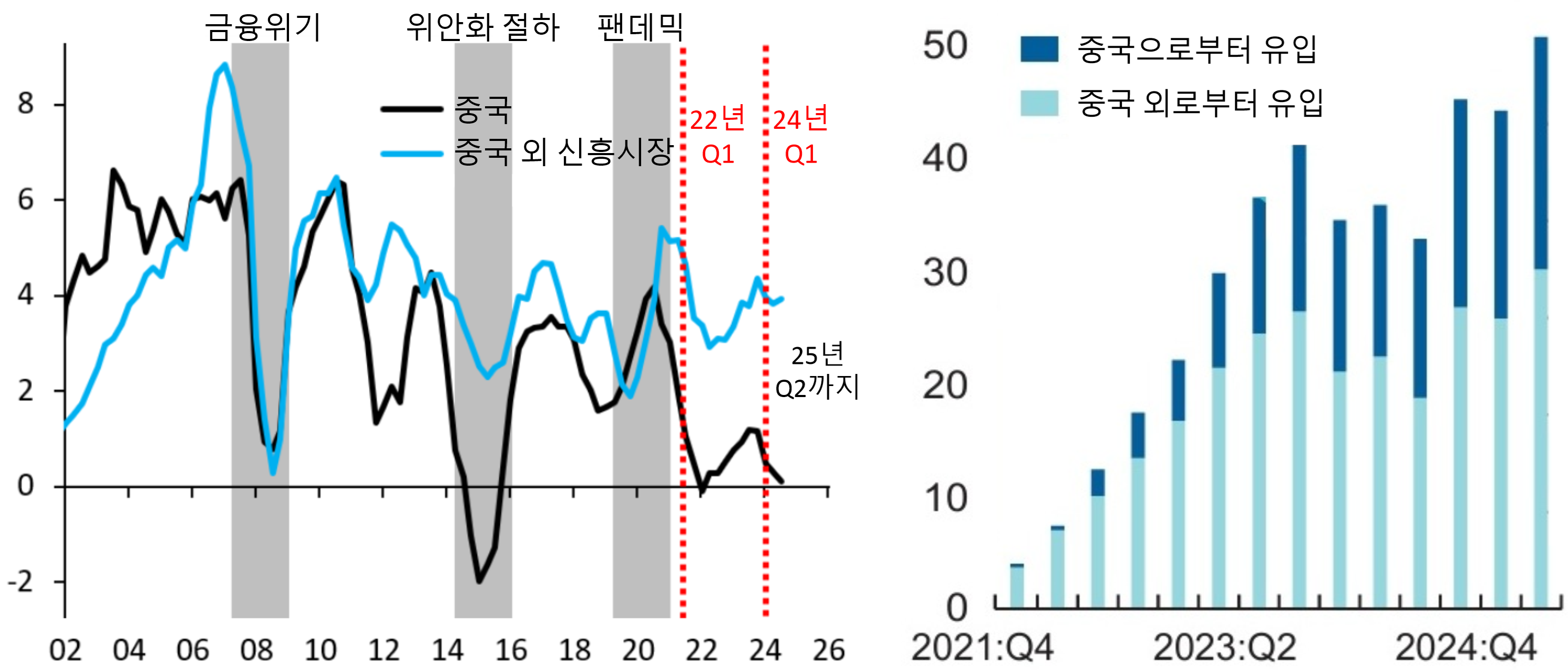 한편 중국의 수입은 여전히 중간재와 자본재 중심으로 글로벌 공급망 의존이 지속되고 있으나, 일부 중간재와 기계 부문에서는 국산화가 진행되며 수입 의존도가 완만히 낮아지고 있다. 동시에 에너지와 원자재는 러시아·중동·아프리카·동남아 등 ‘글로벌 사우스’에 대한 의존도가 높아지는 한편, 이들 지역에 대한 투자를 확대하며 경제적 종속 관계를 강화하는 전략도 병행한다. (이는 3장 1절에서 다룬다)