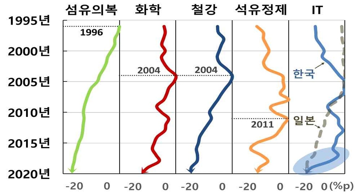 먼저 ‘2차 차이나 쇼크’가 주는 충격이다. 한국의 대중 수출은 중간재·자본재에 크게 의존했으나, 2010년대 중반 이후 반도체를 제외한 대부분 품목에서 수출이 정체되거나 감소했다. 그 결과 2024년에는 수교 이래 처음으로 대중 무역적자를 기록했다. 직접 수출뿐 아니라, 중국 생산에 한국 중간재가 얼마나 투입되는지를 보여주는 수출연계생산 역시 2021년을 기점으로 감소세로 전환되었다. 이는 경기 요인에 의한 것이라기보다, 중국의 중간재 자립, 최종재 자국화, 그리고 공급망 재편이라는 구조적 변화의 결과다. 섬유·의복에서 시작된 이러한 변화는 철강, 화학·정유를 거쳐 최근에는 IT 산업까지 확산되며, 한국 제조업의 중국 의존적 성장 모델이 더 이상 작동하지 않음을 보여준다.