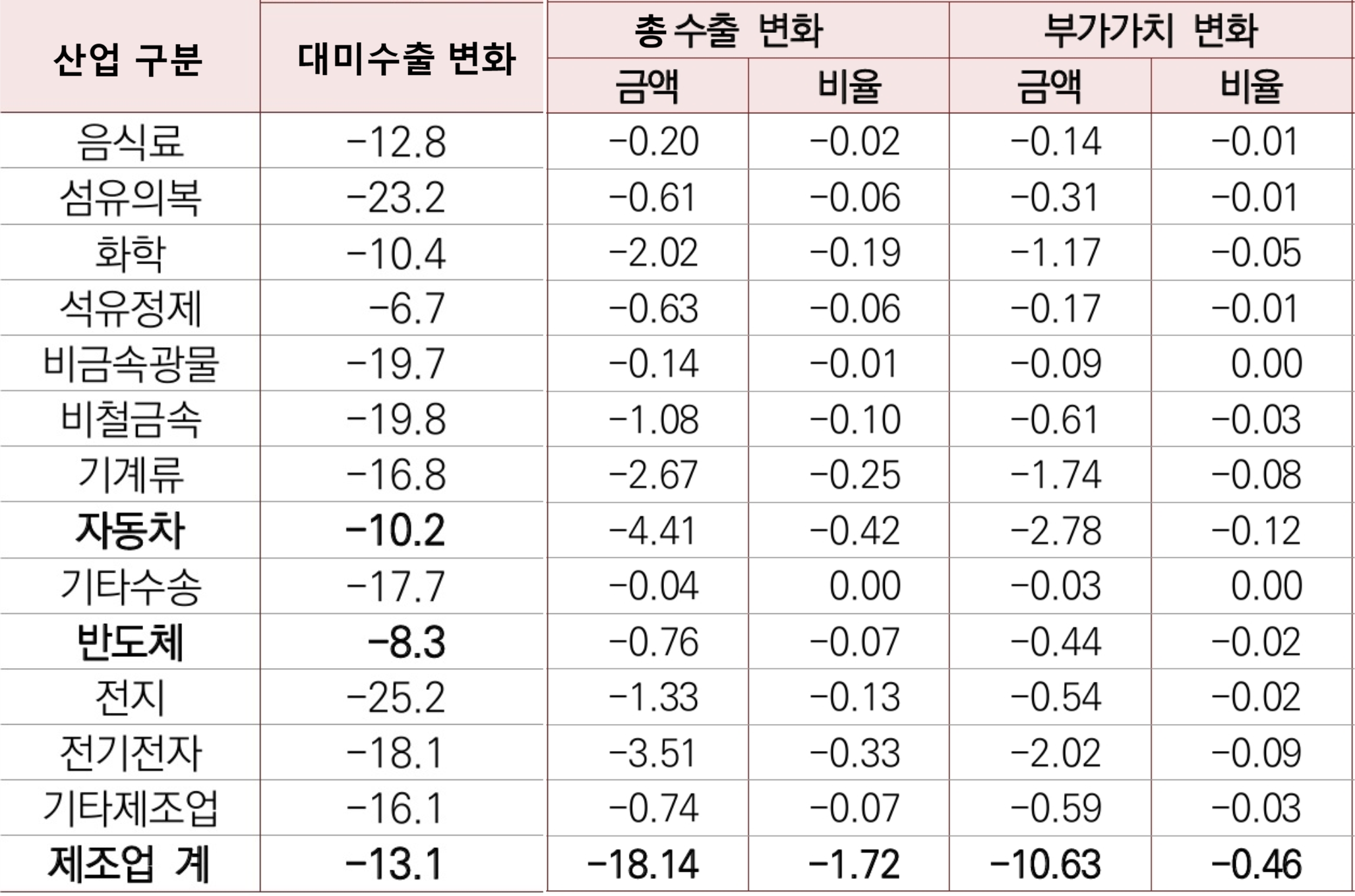 [그림] 트럼프 2기 관세가 한국 제조업에 미치는 영향 추정치 (%, 조 원)