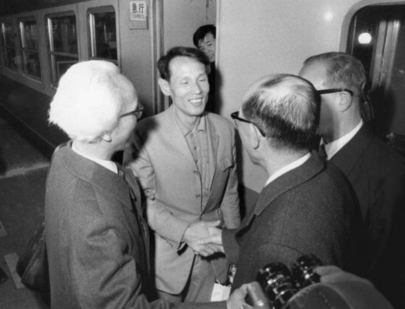 1973년 1월 26일, 히로시마적십자병원에서 입원 치료를 받고자 히로시마역에 도착한 손진두 씨(왼쪽 두 번째)와 이를 도운 일본인 연대자들의 모습이다. [사진출처: 《주고쿠신문》]