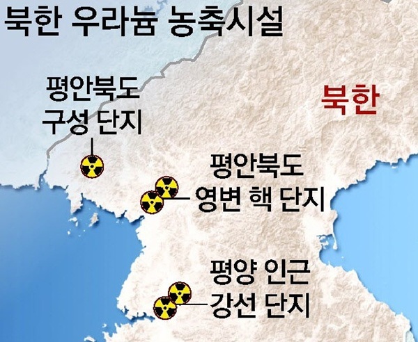 [그림] 북한 우라늄 농축시설 추정 위치 (자료출처: 《동아일보》)