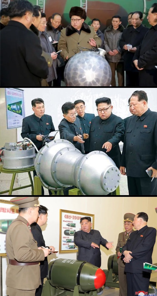 특히 2017년 9월에 실시된 (마지막) 핵실험은 100킬로톤을 훨씬 넘는 위력을 보였으며, 북한이 열핵무기, 또는 적어도 혼합연료를 사용하는 (복합) 핵무기를 개발하는 데 성공했음을 보여주었다. 직후 공개한 사진([사진] 가운데)에서 김정은 위원장은 땅콩 모양의 핵탄두 옆에 서 있었다. 북한은 이 사진으로 2단계 열핵무기를 암시하고자 했고, 탄두는 외형상 탄도미사일에 장착할 수 있을 정도로 작고 가벼워 보였다. 그러나 이것이 실제 핵탄두인지, 실물크기 모형인지 알 수 없다. 북한이 말하는 ‘수소폭탄’이 2단계 열핵무기가 아니라, 삼중수소를 사용하여 단일 핵분열 장치의 효율을 높이는 무기일 가능성도 있다. 어쨌든 삼중수소의 반감기가 상대적으로 짧고, 북한의 삼중수소 생산속도가 낮아서 북한의 증폭 핵무기 또는 열핵무기 생산 능력은 제한적일 것이다.
