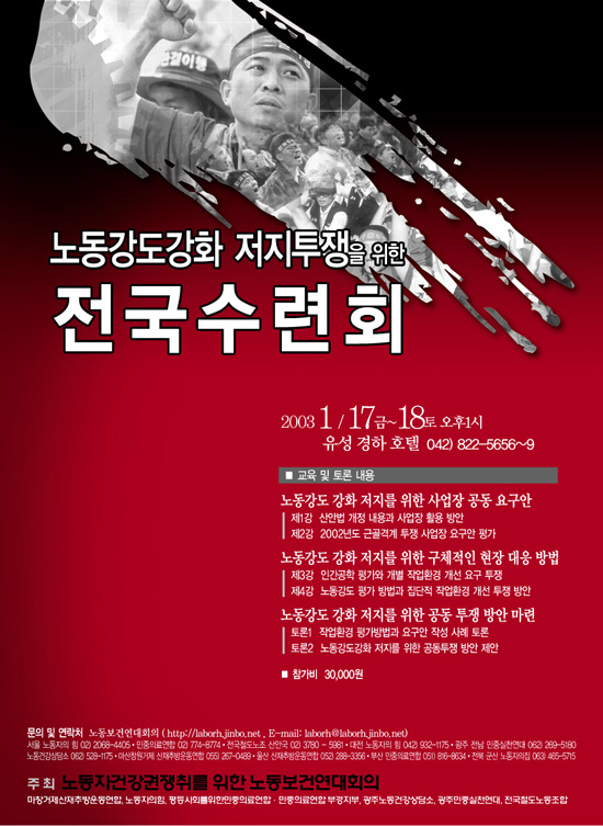 두 번째 토론 제안자인 강동진(노동보건연대회의 집행위원장, 민의련 대표)은 2003년 투쟁이 지난 해 투쟁의 강화·발전으로 이어지기 위해서는 직업병 인정 투쟁을 넘어 선 노동강도 완화 투쟁으로 그 투쟁의 목표를 분명히 할 것, 사업장 및 지역 투쟁을 벗어나서 전국적 전계급적 투쟁으로 발전시킬 것이 과제로 설정되어야 한다고 주장하고, 이를 위해 '노동강도 강화저지 투쟁 전국회의(가칭)'을 제안하였다. 조직의 정치적 목표는 노동강도 강화 저지로 분명히 하고, 참여 주체는 투쟁을 준비해온 사업장의 노동조합과 관심이 있는 현장 조직 및 노동사회단체가 포괄되는 조직 등으로 하며, 전국회의 참여의 책임 및 권한에 관해서는 대표자 회의를 통해 투쟁 방향 및 집행 기조에 대해 논의하고 합의된 내용에 대해 공동 실천하는 것 등이 제기되었다. 이 토론은 이후 조별 토론 및 공동토론에서 진행되었다.