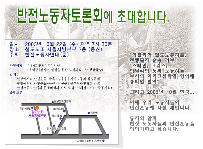 그리고 반전운동을 당장 대중적으로 전개하기에는 많은 어려움이 있지만 반전노동자 연대가 한발 앞서 실천하는 활동가들의 투쟁의 장으로서 역할을 하고자 한다고 했다. 다른 사업장 다른 정치적 견해를 갖고 있는 현장 조직간의 공동실천의 경험은 소중한 경험이 될 것이다.