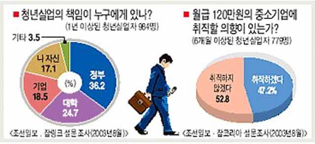 2004년 들어 다시 실업률이 급증하고 있다. 전체 실업률은 3.4%, 청년실업률은 8.9%에 육박한다. 실업률 통계자료의 특징은 신규실업자의 급증과 청년실업, 여성, 고령자 층 실업률의 급증과, 구직기간이 짧은 실업자의 높은 비중으로 요약된다.{{ 청년 실업률 - 15세 이상 29세 이하의 경제활동인구; 2003년 8.9%로 전년대비 0.9%증가,