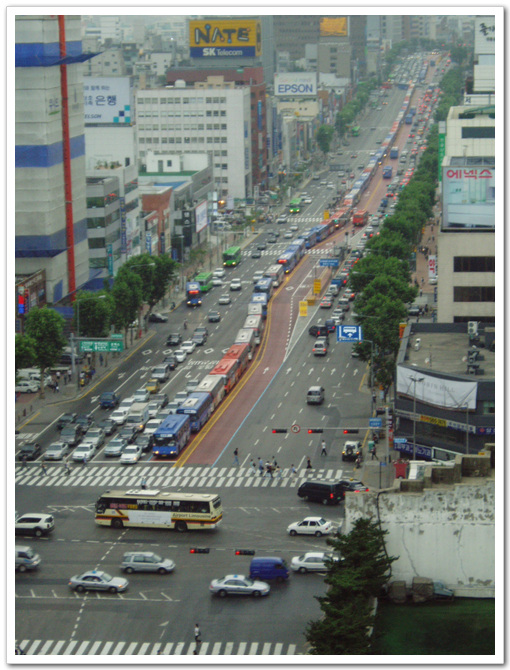 -도로 중앙에 버스전용차로를 설치하고 위성을 통해 BMS{{) Bus Manengement System 위성항법장치(GPS)를 이용한 버스단말기, 버스정류소 안내시스템