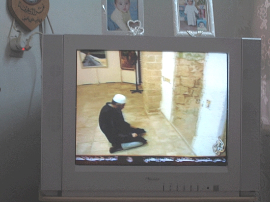 집에 가니 칼리드의 아버지께서 계셨습니다. 칼리드가 아버지는 1967년 이스라엘이 서안지구를 점령하기 이전, 요르단 통치 아래서 공산주의자라는 이유로 9년 동안 감옥에 있었던 적이 있다고 얘기를 했습니다. 또 1차 인티파다1)때는 칼리드를 포함해 칼리드의 형제 1명과 아버지가 함께 감옥에 간 적도 있어서 집에 어머니와 자매들만 남은 적도 있었다고 합니다. 칼리드는 인티파다 이전에 2번, 인티파다 때 5번 총 7번 이스라엘 감옥에 다녀온 적이 있습니다. 그 가운데 몇 번은 어떤 재판이나 그런 것 없이 임의로 몇 달씩 갇혀 있었던 적도 있습니다. 한 무슬림이 기도를 하고 있는 장면을 보여주고 있는 알 자지라