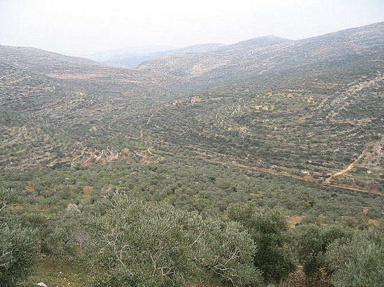 아무튼 무클레아를 사용하기 위해서는 넓은 공간이 필요했고 우리는 마을을 지나 맞은편 고개를 넘었습니다. 고개를 넘어 서는 순간 저는 제 눈을 믿을 수 없었습니다. 팔레스타인 어느 곳을 가나 올리브 나무를 쉽게 볼 수 있지만 이 곳처럼 산과 산을 넘어 끊임없이 펼쳐진 ‘올리브 나라’는 처음 보았습니다. 칼리드가 올리브 나무가 몇 그루나 되는지 세어볼 수 있겠냐고 하더니 한국 사람들이 모두 여기로 와서 한꺼번에 세어보면 아마 셀 수 있을 거라고 농담을 했습니다. 끝없이 펼쳐진 올리브 나라. 사진에는 보이지 않지만 사진 왼쪽에도, 오른쪽에도 올리브 나라가 이어집니다.