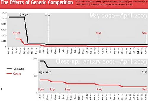 제네릭 경쟁의 효과: stavudine (d4T) + lamivudine (3TC) + nevirapine (NVP)의 연간 환자당 비용. 제네릭 경쟁은 의약품 가격을 낮추는데 가장 효과적인 수단임을 보여준다. (Untangling the web of price reductions: a pricing guide for the purchase of ARVs for developing countries.2005.2. http://www.accessmed-msf.org/documents/untanglingtheweb%207.pdf)