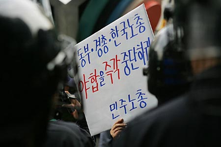 복수노조 허용은 지난 97년부터 지금까지 두 번에 걸쳐 10년간 적용이 유예되어 온 바, 이번에야말로 도입하나 했더니 또 다시 정치적 거래의 대상으로 전락되었다. 한국노총에서 전임자 임금문제가 노조 보존을 위해 절박하다면 이를 금지하려는 정부와 자본을 비판하고 광범위한 반대운동을 조직할 일이지 노동자의 기본권을 희생시켜 맞바꾸는 것은 있을 수 없는 일이다. 그렇게 해서 보존된 노조는 과연 누구를 위한 것인가? (사진 출처: 레이버투데이) 9월 11일 노사정대표자회의가 열리고 있는 노사정위 앞에서 민주노총은 항의시위를 가진 데 이어 노사정대표자회의가 열린 노사정위 21층으로 진입해 몸싸움을 벌이고 격한 항의농성을 벌였다. 이날 민주노총 집회대오는 회의장을 빠져나오는 이용득 위원장과 충돌이 빚어지기도 하는 한편 한국노총 앞까지 진출해 항의시위를 벌였다. 바로 다음날인 12일, 11일 노사정위원회 앞에서 한국노총과 민주노총 간부들간에 마찰이 빚어진 것과 관련, 한국노총이 "집단 폭력을 공식 사과하라"며 민주노총 앞에서 규탄대회를 여는 사태가 일어났다. 한국노총 소속 조합원 700여 명은 한국노총 앞에서 집회를 연 후, 영등포로터리에 위치한 민주노총까지 행진해 규탄대회를 가졌다.