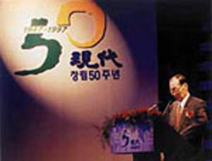 "본인은 현재 시대의 흐름과 우리 경제의 앞날을 생각할 때 과거에는 그룹 체제가 각사간의 협조라는 장점이 있었으나 이제 세계적인 흐름과 여건은 각 기업들이 독자적인 전문경영인체제로 운영하는 것만이 국제 경쟁사회에서 성공할 수 있는 길이라고 생각합니다. 따라서 본인은 이제 오늘부터 모든 경영일선에서 물러나고 또한 정몽구 회장과 정몽헌 회장도 함께 모든 경영일선에서 물러나겠습니다.... 중략.... 우리는 앞으로 전문경영인들이 운영하는 회사에 주주로서만 남아서 지켜보도록 하겠습니다."