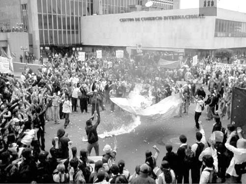 2005년 9월에 콜롬비아에서 진행된 FTA 반대 시위의 모습. 농민과 원주민을 비롯한 다양한 민중들이 이틀동안 거리를 점거했다. 출처 : http://colombia.indymedia.org