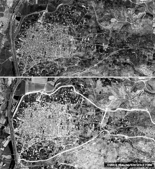 1) 이스라엘은 지난 수십 년간 서안지구에 불법적으로 정착촌들을 만들고, 이를 보호한다는 미명 아래 ‘녹색선’을 침범해왔다. 유엔은 조사를 통해 장벽이 건설되기 전에도 이스라엘의 차단벽들과 기간시설, 그리고 점령촌들이 서안지구에서 50개의 차단된 팔레스타인 고립지구를 만들어냈다고 추정했다. 본문으로