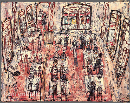 정신병자의 그림에 예술작품의 지위를 부여한 것으로 잘 알려진 장 뒤뷔페. 올초 덕수궁미술관에서 열린 그의 전시회에 소개된 이 작품은 그의 도시연작(파리)중 하나로, 언뜻 보기에 레스토랑을 채운 사람의 열기로 인해 젊고 발랄한 도시적 분위기가 느껴지는 듯하다. 그러나 서로를 원하는 듯하면서도 서로에게 무심해 보이는 그림 속 사람들의 관계망은, 타인과 소통하고 싶지만 닫힌 구조 안에서 절망하는 현대인의 자폐적 증상을 닮아있다.