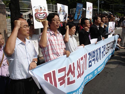 미국산 소고기 수입반대 투쟁이 계속되고 있다. 한․미 FTA 체결의 선결과제로 제시된 미국산 소고기 수입이 지난 4월에 재개되었으나, 검역조건에 맞지 않는 뼛조각과 척수가 계속 발견되고 있어 논란이 되고 있다. 한․미 FTA반대 운동은 미국산 소고기가 광우병의 위험이 높다는 사실을 이슈화하고 있다. 반면 정부는 미국산 소고기의 안전성을 장담하면서 국제수역사무국(OIE) 규정에 위배되지 않는다는 형식 논리로 일관하고 있는데, 수입과 검역에 대한 무원칙한 대응으로 미국의 눈치 보기라는 비판이 설득력을 얻고 있다.